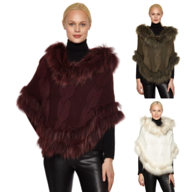 Style#BALRFK111 FOX Trimmed Cable Knit Hooded Poncho ~ $395.00 ~ ~ Black, Navy, Olive, Tan ~ ~ O/S ~